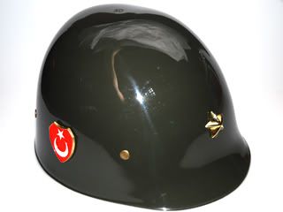 An East German Model M-56/70 steel helmet reissued to the Turkish Army from the 1990s. These helmets typically featured various Turkish military insignia, and a variety of helmet covers were used.