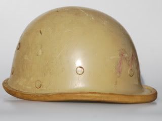 A bring back from the 1990 Gulf War, this helmet features a rubber rim to help hold a camo cover in place. These helmets, as with the later examples were made in South Korea. It is not clear why the letter "M" is scratched on the front - was it done in the field or by the American veteran? | ||||||||||||