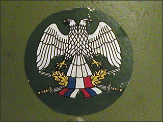 This current issue Serbian helmet was first used in the recent Civil Wars in Yugoslavia. It features a decal representing Serbia. This style helmet is also currently used by the Macedonian army.